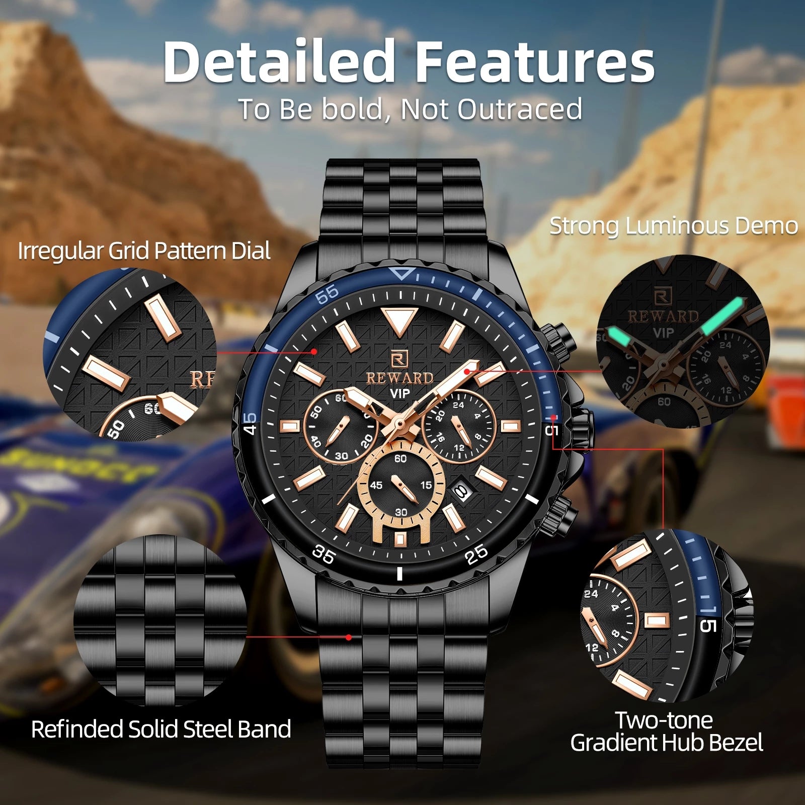 REWARD 81101 VIP Business High Quality Men Quartz Watch Original Stainless Steel Strap 3 Dials Chronograph Date Display Sports Wrist Watch